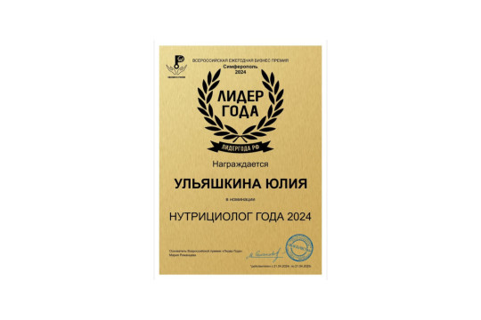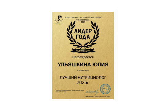«Лучший нутрициолог» 2024 и 2025 по версии Всероссийской премии ЛИДЕР ГОДА